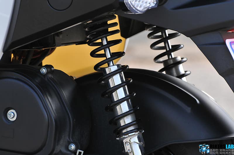 리어 서스펜션은 동급의 경쟁모델이 모노 쇽업소버인데 반해 더블 쇽업소버를 장착했다. 저속으로 자잘한 요철을 지날 때는 충격을 어느 정도 걸러내는 듯하지만 고속에서 큰 둔턱을 만나면 움찔하기는 마찬가지다. 그래도 붕 뜬 차체를 다시 안정적으로 잡아내는 과정은 유연하다. 동급 기종과 비교해 엄지손가락을 치켜세울 만큼의 큰 차이는 없지만 어쨌든 두 개가 지탱해주니 조금은 낫다. 적재물의 무게 등에 따라 5단계로 쿠션을 조절할 수도 있다.