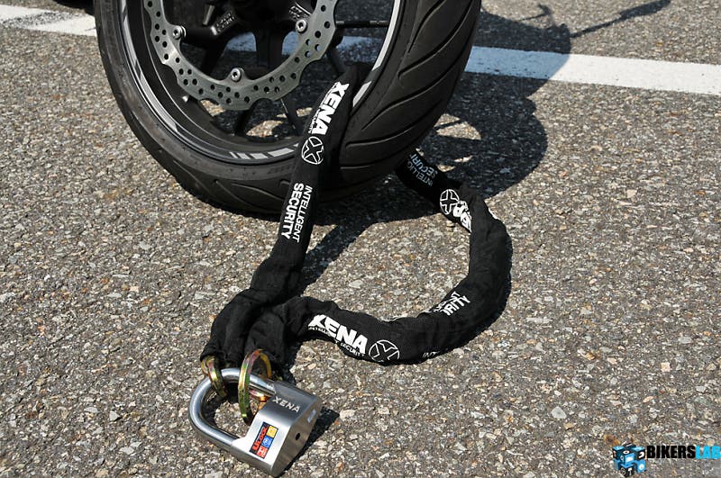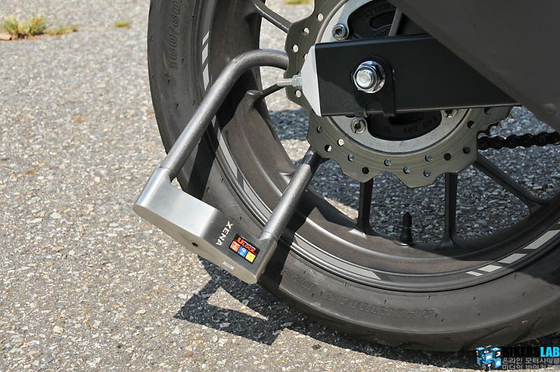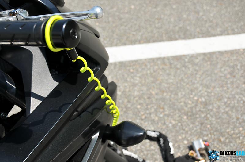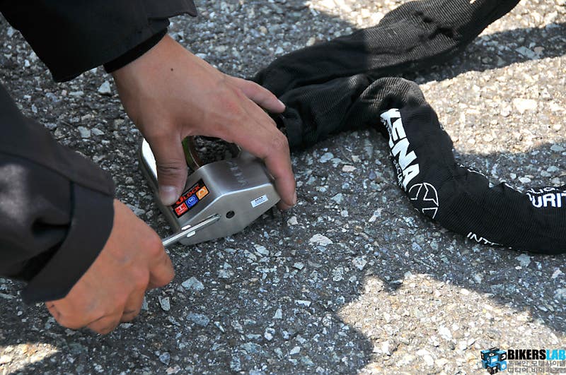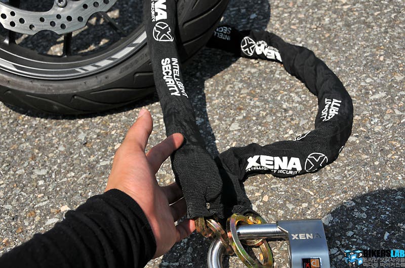 아름다운 자태를 뽐내는 모터사이클을 감상하는 것도 잠시, 프론트 휠에 무언가 거대한 것이 감겨있다. 프론트 휠의 휠 스포크를 통과하는 굵은 전선 같이 생긴 이것은 체인락이다. 해당 기사에 사용한 체인락은 제나(XENA) XC10-150이다. 이 체인락의 길이는 150cm, 무게는 무려 3.8kg으로 보기만 해도 존재감이 느껴진다. 10mm 강철 체인을 커버로 덮어놓아 내구성 또한 강하다. 가방에 빈약한 도구만 챙겨온 도둑으로서는 난감한 상황이었다. 이렇듯 케이블락의 시각적인 효과는 상당하다. 생김새만으로 절도 의지를 꺾어버릴 수 있다.