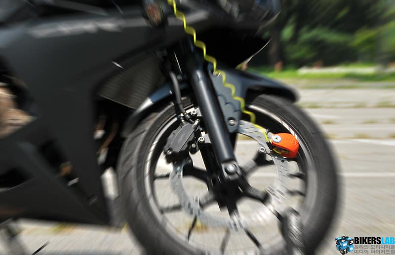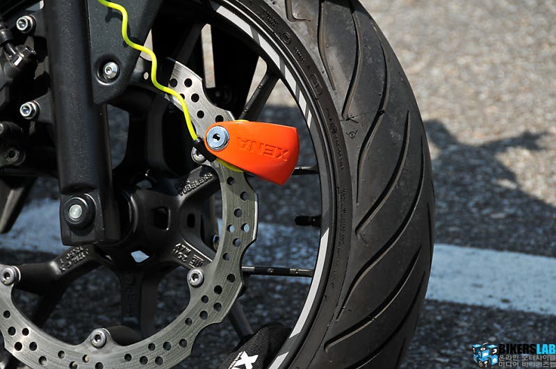 유심히 프론트 휠을 살펴본 도둑. 그제서야 프론트 휠 디스크 구멍에 달려있는 디스크락을 발견했다. 다른 잠금장치에 정신이 팔려 가장 대표적인 보안 장치인 디스크락을 잊어버린 것이다. 좀 더 노련한 도둑이었다면 디스크락에서부터 핸들에 걸쳐 달려있던 리마인드 케이블(디스크락 장착을 잊고 모터사이클을 출발 했을 때 입을 수 있는 손상을 미연에 방지하는 케이블)을 보고 디스크락의 존재를 눈치 챘을 것이다.