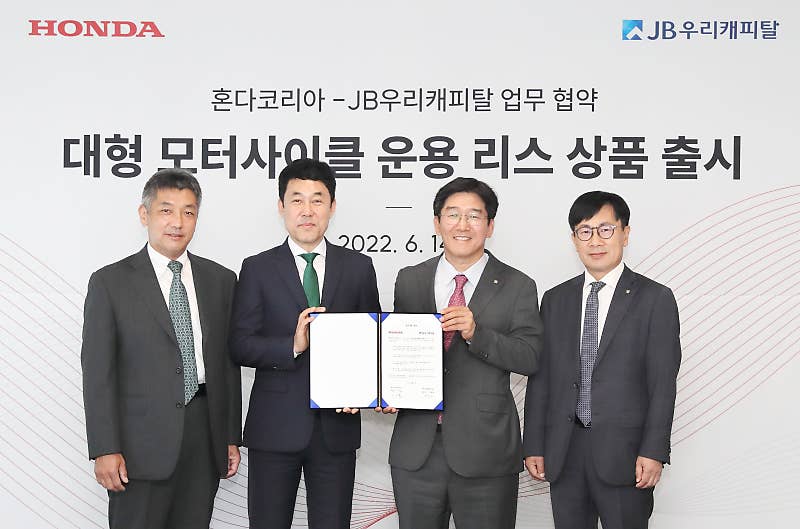 혼다코리아(대표이사 이지홍)는 대형 모터사이클 고객의 구매 기회 확대 및 만족도 증대를 위해 JB우리캐피탈과 업무제휴 협약(MOU)을 체결하고, 오는 7월 1일 ‘대형 모터사이클 운용리스 상품’을 출시한다고 밝혔다.