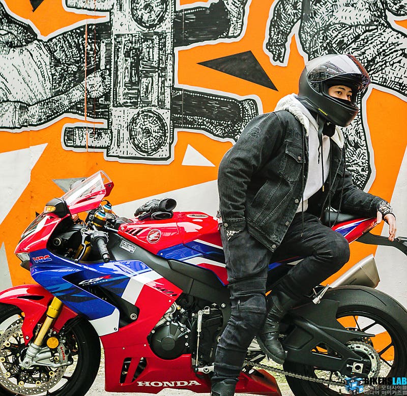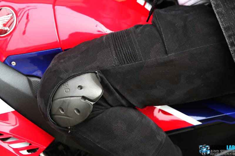 모빈스알로 코디하고 모터사이클에 올랐다. 시승 기종은 혼다의 슈퍼스포츠 CBR1000RR-R이다. 시승 기종은 무릎이 45도 이내로 굽혀지며 상체도 전방으로 많이 쏠리기 때문에 어떤 장르보다 라이딩 기어의 편안함과 신축성이 요구된다. 팬츠와 재킷에 프로텍터를 빠짐없이 장착했다.