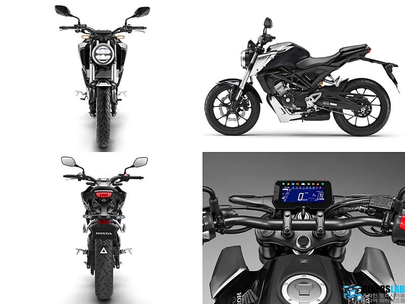 CB125R124.7cc 수랭식 단기통 엔진을 탑재해 13.3마력의 최고 출력과 1.1kg*m의 최대 토크를 발휘하며 6단 변속기를 맞물려 100m 7.3초 만에 가속한다. 고강성, 경량을 실현한 튜블러 스틸 프레임과 심플한 차체 구성을 기반으로 건조 중량은 125.8kg에 불과하다. 또한 41mm 도립식 프론트 포크, 프리로드 조절이 가능한 모노 쇽업소버, 테이퍼드 핸들바, 니신 4P 래디얼 캘리퍼, 296mm 플로팅 디스크, IMU(관성측정장치) 기반의 2채널 ABS, LED 헤드라이트 등을 탑재해 우수한 경쟁력을 갖췄다.