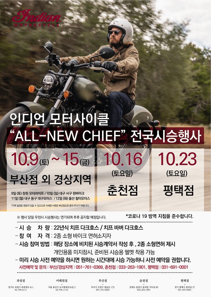 이후 10월 13(수)일부터 15일(금)까지 3일간 인디언 모터사이클 부산점, 10월 16일(토) 춘천점, 10월 23일(토) 평택점에서 치프 시승회를 연다. 이번 시승 행사에 참여하려면 해당 장소에 비치된 시승계약서를 작성하고 2종 소형 면허를 제시하면 된다.