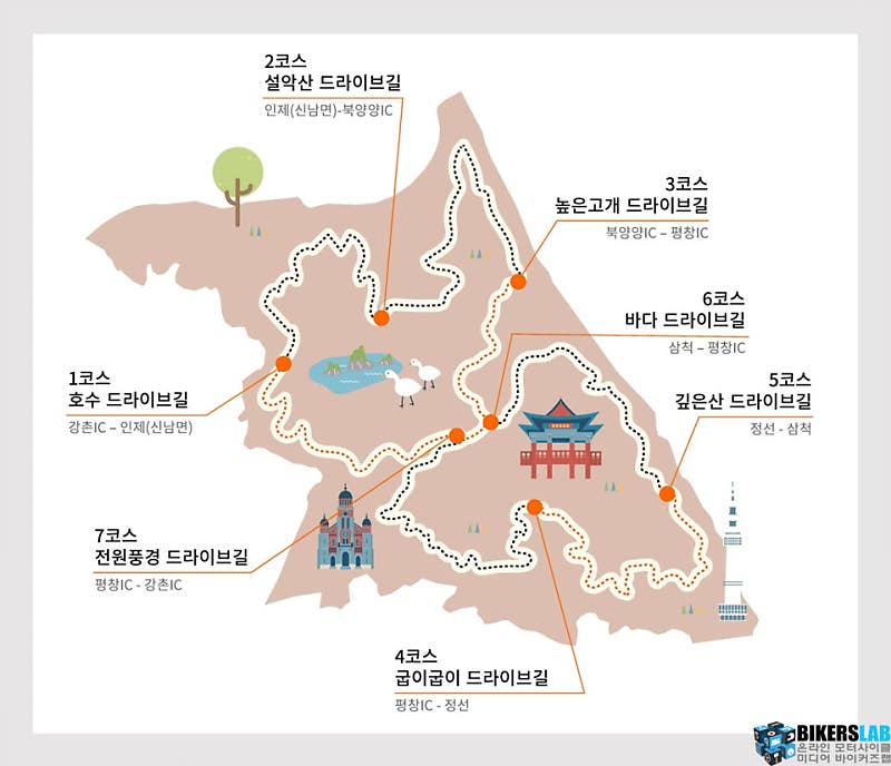 라이딩 루트는 1코스 호수 드라이브길(강촌IC~인제), 2코스 설악산 드라이브길(인제~북양양IC), 3코스 높은 고개 드라이브길(북양양IC~평창IC), 4코스 굽이굽이 드라이브길(평창IC~정선), 5코스 깊은 산 드라이브길(정선~삼척), 6코스 바다 드라이브길(삼척~평창IC), 7코스 전원 풍경 드라이브길(평창IC~강촌IC) 이상 강원도의 정취를 오롯이 느낄 수 있도록 구성했다.