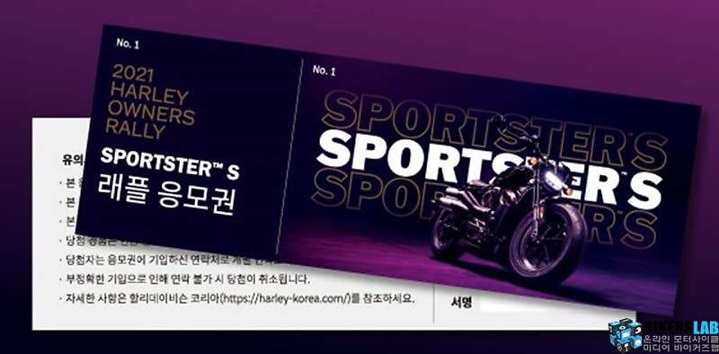 마지막은 모터사이클 경품 추첨 이벤트로, 출시를 앞둔 신모델인 ‘스포스터 S(Sportster™ S)’ 1대가 증정된다. 응모 자격은 랠리 패키지를 수령한 모든 정식 참가자이며, 추첨은 10월30일 토요일, 할리데이비슨 코리아 공식 유튜브 채널에서 라이브 스트리밍을 통해 실시된다. 자세한 시간은 공식 채널을 통해 추후 업데이트 된다.