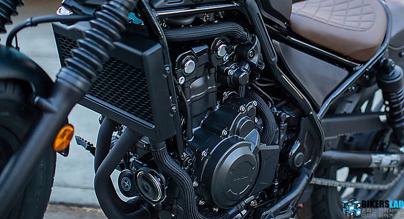 또 한가지 흥미로운 부분은 엔진이다. 레블 500은 471cc 수랭식 병렬 2기통 엔진을 탑재했는데 최대 토크(4.4kg*m)가 발생하는 구간을 6,000rpm으로 설정했다. 일반적인 크루저가 3,000~4,000rpm영역에서 최대 토크를 발휘하는 것과는 확연한 차이가 있다. 최고 출력이 발휘되는 시점도 8,500rpm으로 크루저 보다는 네이키드 모터사이클에 가까운 세팅이다. 보어와 스트로크의 크기는 67mmX66.8mm로 비율이 1:1에 가깝다. 이로 인해 기대할 수 있는 부분은 스포티함이다. 고회전영역으로 몰아붙일수록 점점 강력한 출력을 쏟아내니 스포티한 주행 질감을 만끽할 수 있다.