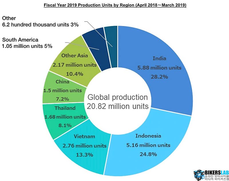 혼다는 1948년 처음으로 모터사이클을 생산하기 시작했다. 슈퍼 커브의 시초인 C100이 1958년에 탄생했으며, 그 인기에 더불어 1968년에 천만 대 생산을 돌파했다. 1963년에는 벨기에에 생산 공장을 신설하며 첫 수출을 시작했다. 이후 1967년 태국, 1971년 인도네시아, 1976년 브라질과 이탈리아, 1979년 북미에서 판매를 개시하며 아시아와 유럽을 넘어 아메리카 대륙까지 무대를 넓혔다. 지속적인 성장과 확장으로 1997년 1억 대 생산을 달성했고 이후 22년 만에 3억 대를 더 생산하는 기염을 토했다.