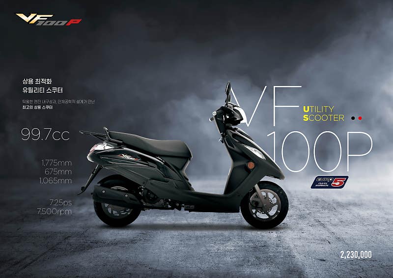 VF100P는 유로5를 충족하는 인젝션 타입의 99.7cc 엔진을 저중심 설계해 안정감을 높였고 730mm의 낮은 시트고로 부담은 줄였다. 브레이크는 프런트 디스크, 리어 드럼 브레이크를 장착했으며 1,230mm의 짧은 휠베이스로 회전 반경이 짧다.