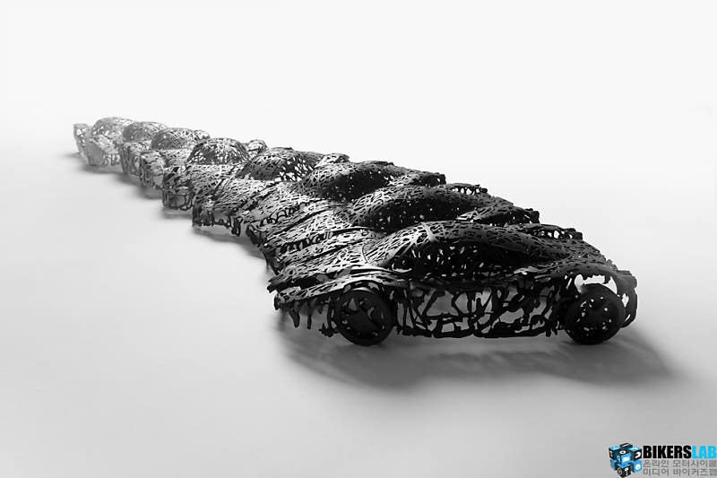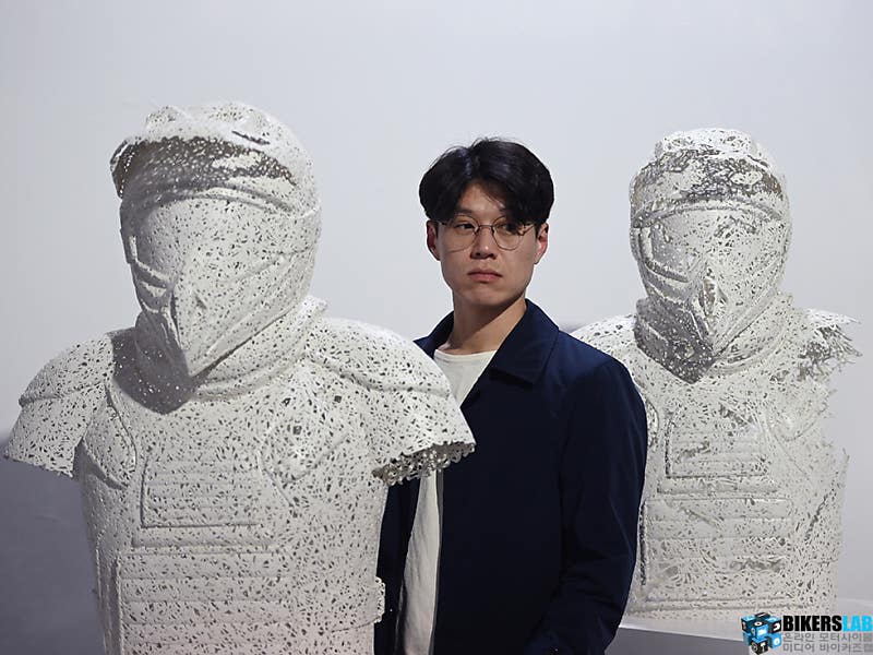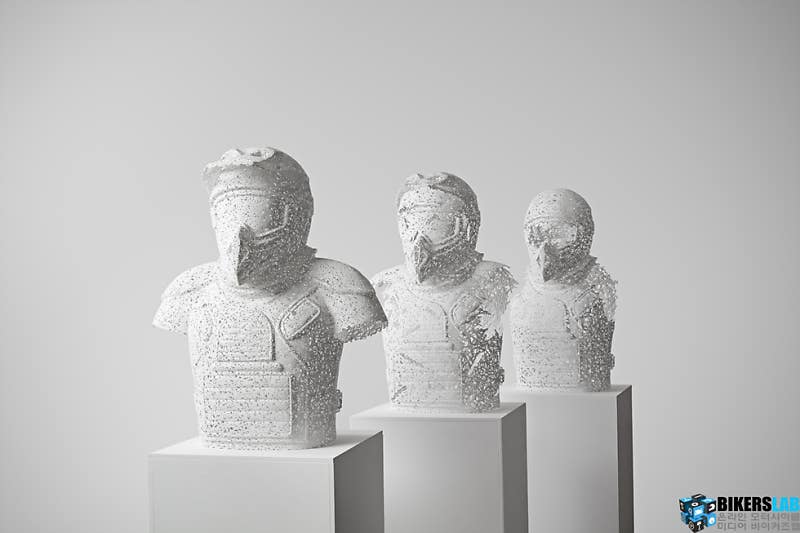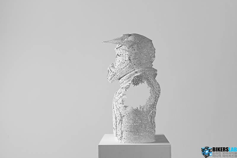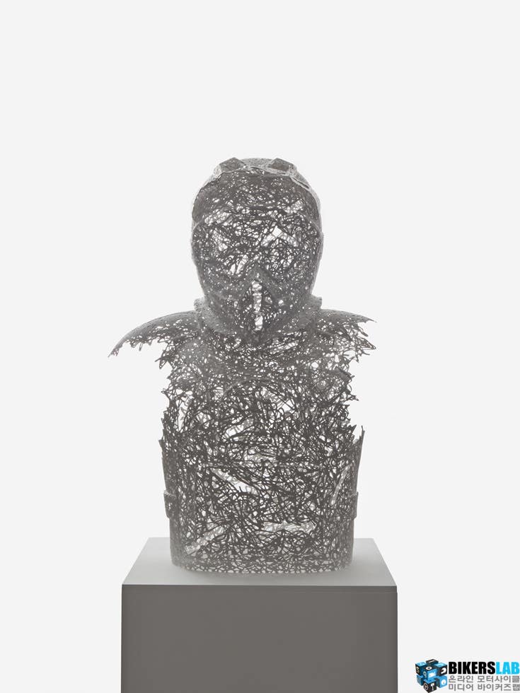 혼다 파빌리온 2층에 마련된 ‘혼다 갤러리’ 한쪽에는 모토크로스 선수들의 흉상이 전시되어 있다. 그런데일반적인 흉상과는 다르다. 언뜻 보면 섬유 소재로 겉을 구현한 것처럼 얼기설기한 질감에 구멍이 숭숭 나 있고 속은 비어 무척 가벼워 보인다. 팔 부분은 마치 낡은 유물처럼 해져 있다.
