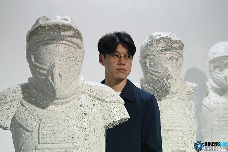 이번 서울모터쇼의 혼다 갤러리에 전시한 모토크로스 선수의 흉상은 2013년에 만든 작품이다. 전시되지는 않았지만, 비슷한 시기 그의 작품 중에는 모토 GP 등 모터사이클 레이스 선수들이 입는 일체형의 수트를 형상화한 작품도 있다.