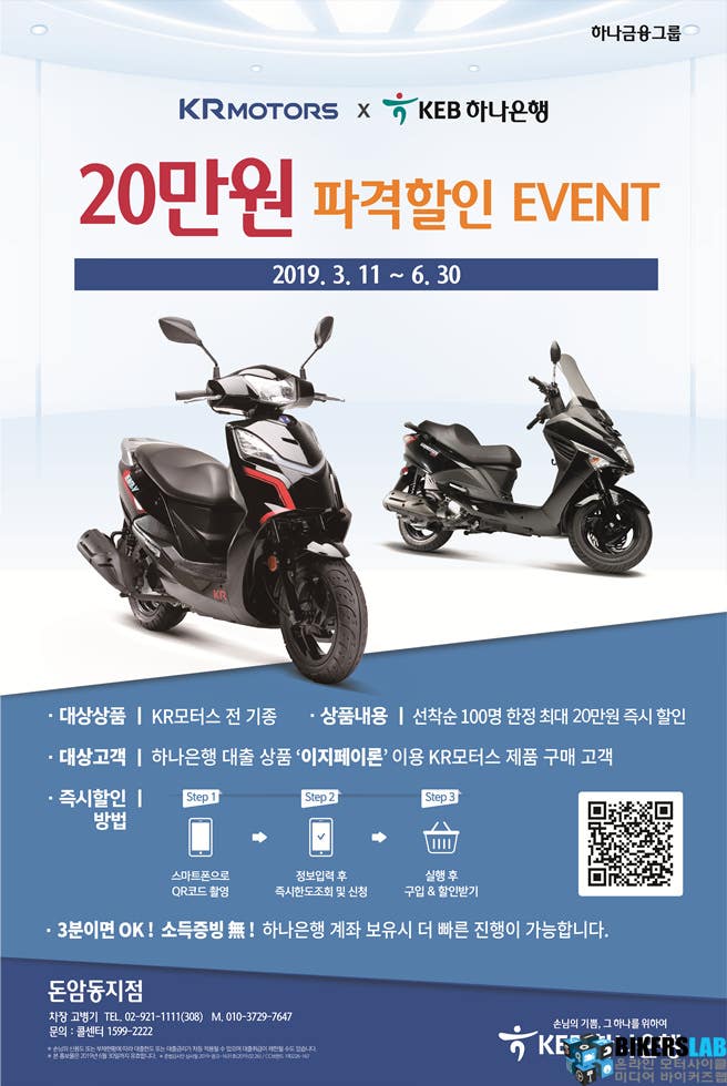 이번 제휴 이벤트는 하나은행의 금융상품인 「이지페이론」을 이용하여 KR모터스의 제품을 구입하는 모든 고객들에게 20만원 가격 할인 혜택을 제공한다. 「이지페이론」은 스마트폰의 QR코드를 사용하여 증빙서류 없이 3분 안에 쉽고 빠르게 이용이 가능한 금융 상품이다. KR모터스의 전용 QR코드를 사용하여 「이지페이론」을 이용 후, 간단한 신청서만 작성하면 누구나 20만원 가격할인 혜택을 즉시 제공받는다.