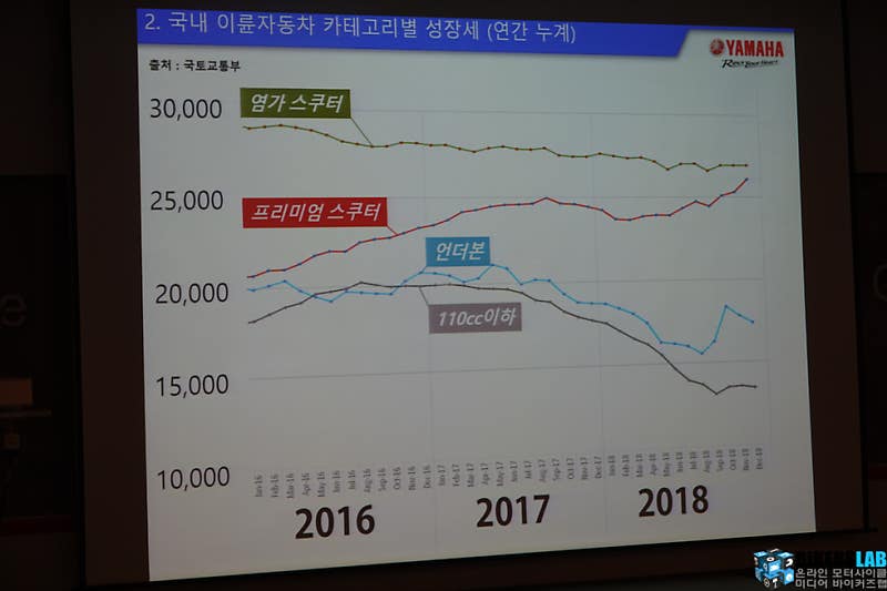 대형 부문의 성과도 우수했다. 역시 2017년 대비 시장의 전체적인 규모가 감소한 탓은 부정할 수 없지만, 각기 개성 넘치는 기종들로 소비자들을 만족시켰다. 맥시스쿠터 카테고리는 엑스맥스300과 티맥스DX가 꾸준하게 포지션을 지켜냈고, MT-09 등으로 MT시리즈 패밀리의 존재감을 확고히 했다. 지난해 국내 대형 모터사이클 부문(260cc 초과)에서 상위권을 차지한 브랜드는 바로 야마하다. 올해에는 대형 부문에서 비약적인 성장보다는 각 라인업의 안정화를 위한 성장과 점유율 확보를 노릴 예정이다.
