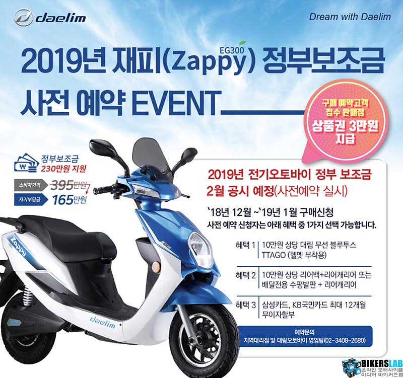 대림오토바이가 전기스쿠터인 재피의 사전예약 이벤트를 진행 중이다. 재피는 작년 정부보조금 모델로 선정되면서 많은 인기를 얻은 대림오토바이의 대표 모델 중 하나로, 보조금 대상 모델 중에서도 높은 판매고를 올려 전기스쿠터에 대한 시장의 관심과 앞으로의 가능성을 보여준 모델로 평가받는다. 특히 작년에는 보조금이 지급되는 전국 대부분의 지역에서 보조금이 일찌감치 소진되어 구입을 하지 못한 대기물량을 기다리는 신청자들이 상당수 존재했다.