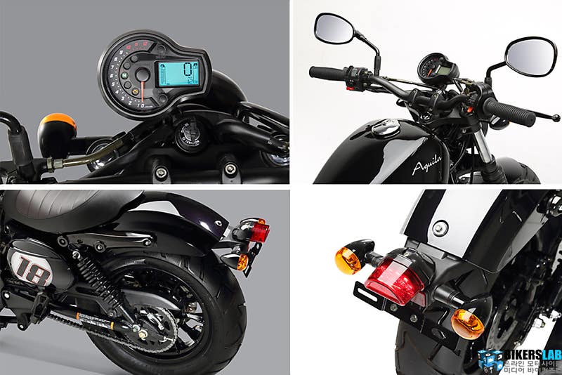 KR모터스의 관계자는 “고효율을 달성하기 위해 기통당 배기량을 확대하고 있는 현재의 모터사이클 시장에서 125cc V트윈 엔진은 독특한 존재이기에 독보적인 존재감을 드러낼 것이다”라고 전했다. 아퀼라125S의 컬러는 더닝 블랙(Dawning black)과 폴리지 실버(Foliage silver) 중에서 선택할 수 있다.