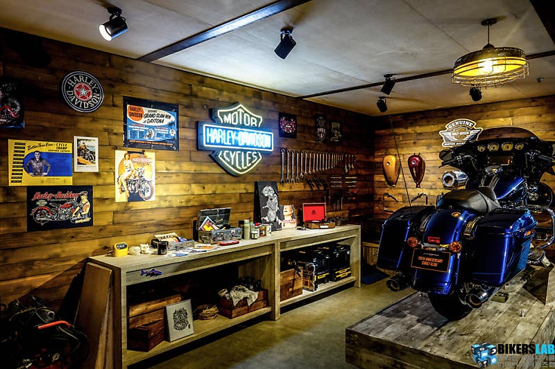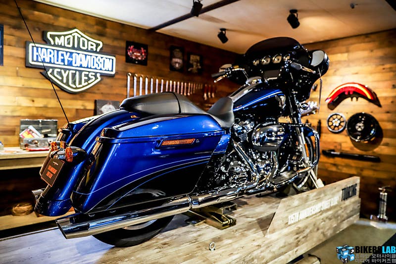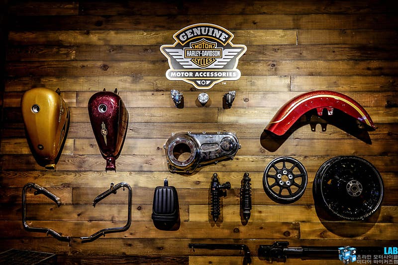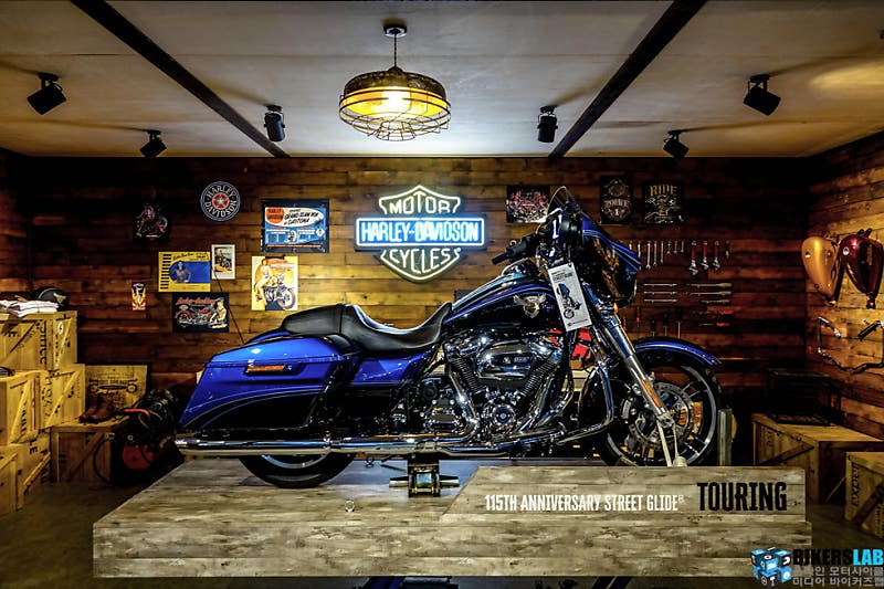 부스 정면의 안쪽에 당당히 자리한 스트리트 글라이드 115주년 모델. 그리고 이와 함께 마련한 개러지. 원목으로 마련한 개러지 안에는 모터사이클 외에도 다양한 것들을 전시했다. 벽에 진열한 공구와 모터사이클 부품 및 액세서리, 복고풍의 포스터와 사진, 선반 위에 놓인 공구함과 LP판 및 각종 정비도구, 라이딩기어와 의류까지. 주황빛의 은은한 조명 아래 비춰진 이 공간은 부스 콘셉트와 트렌드를 표현하기에 부족함이 없었다.