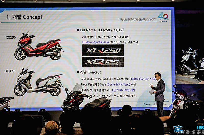 두 번째 신기종인 XQ250은 맥시스쿠터로, 고급스러움과 스포티함을 강조해 디자인했다. 또한 기존의 Q시리즈 및 스티져 시리즈와 비교해 상품성을 크게 향상시켰다. 모든 전구류에 LED를 채용했으며, 역동성을 강조한 디자인으로 맥시스쿠터다운 당당함을 완성했다. 엔진은 247cc 수랭식 단기통으로 22마력의 최고출력을 발휘하며, 연비는 33km/L를 자랑한다.