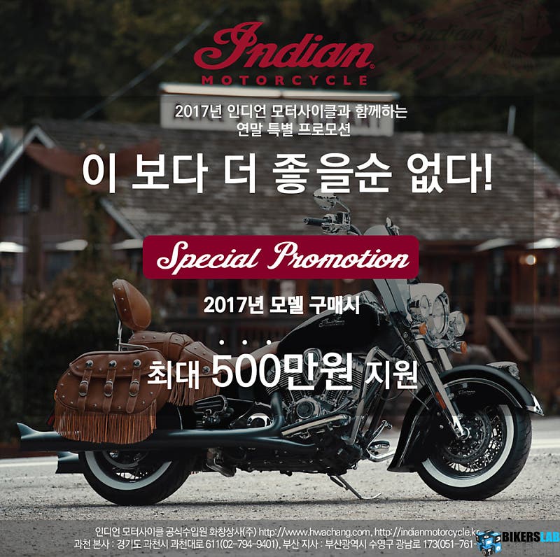 인디언 모터사이클의 공식 수입원인 화창상사가 2017년 연말 프로모션을 진행한다고 밝혔다. 또한 구매 차종에 따라 최대 500만원까지의 혜택을 제공한다.