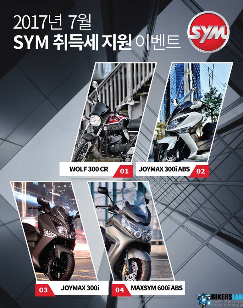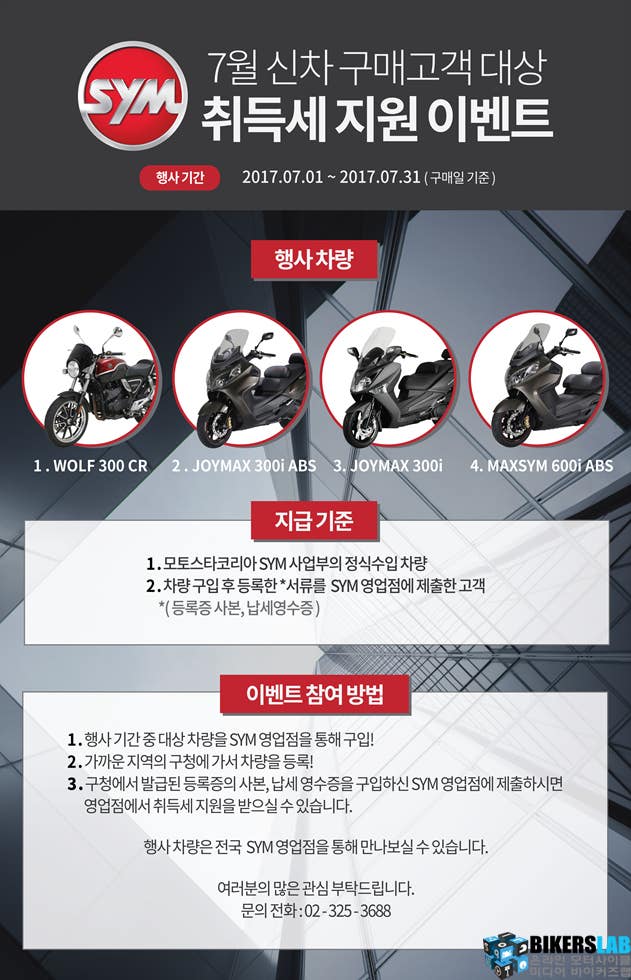 SYM의 공식 수입원인 모토스타코리아가 취득세 지원 이벤트를 조이맥스300i와 조이맥스300i ABS 두 기종을 추가하여 진행한다고 밝혔다. 이벤트에 해당하는 차종은 기존 맥심600i ABS(MAXSYM 600i ABS), 울프300CR(WOLF 300CR)을 포함한 총 네 대이며, 신차 구입고객들에게 혜택을 전달한다.