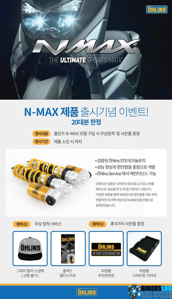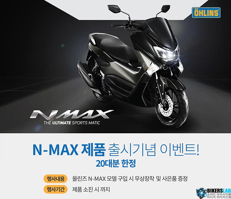 올린즈 코리아가 야마하의 엔맥스 전용 리어 쇽업소버 출시했다. 이에 올린즈 코리아는 구입고객을 위해 무상 장착 및 네 종류의 사은품(올린즈 스냅백, 멀티 스카프, 주차번호판, 스마트폰 거치대)을 증정하는 이벤트를 진행한다고 밝혔다.