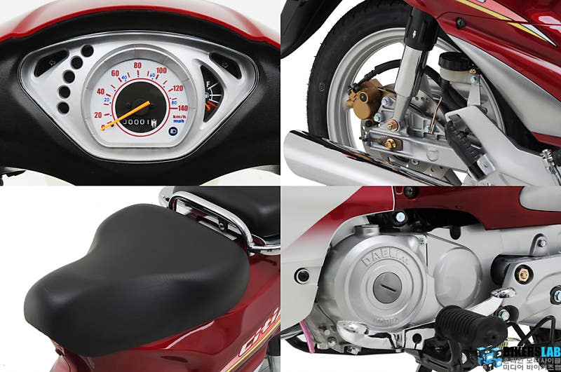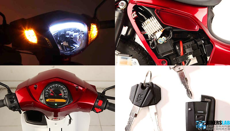시트높이는 735mm로 경쟁기종대비 가장 낮고, 중량 역시 가장 가벼운 100kg이다. 엔진은 109cc 공랭식 단기통으로 8마력(7,000rpm)의 최고출력과 0.87kg*m(5,500rpm)의 최대토크를 발휘하며, 60km/h 정속 주행 시 63.5km/L의 뛰어난 연비를 자랑한다. 휠 사이즈는 전/후륜 모두 17인치로 다양한 노면에서의 원활한 주파성을 확보했고, 브레이크는 앞뒤 모두 드럼을 채용했다. 연료탱크 용량은 4.3L로 적당하다. 색상은 베이지, 레드, 블루의 세 가지로 다양하게 준비했으며, 시트 색상 또한 투톤 컬러를 적용해 고만고만한 커브 디자인 속에서도 보다 감각적인 외관을 연출했다.