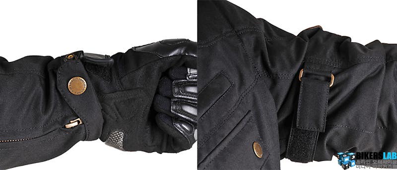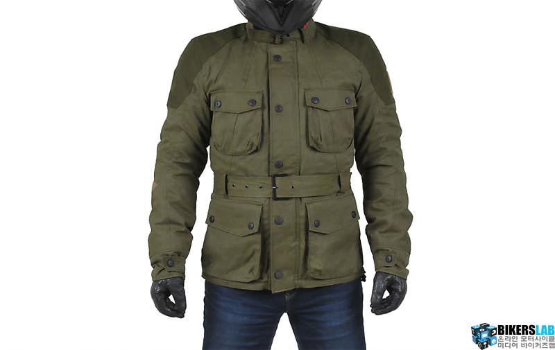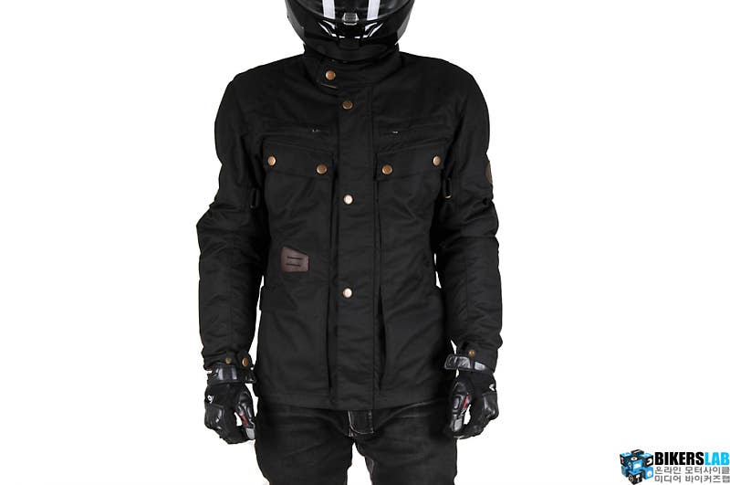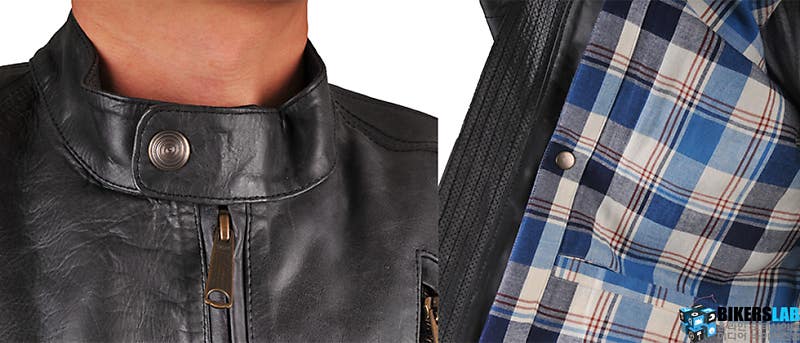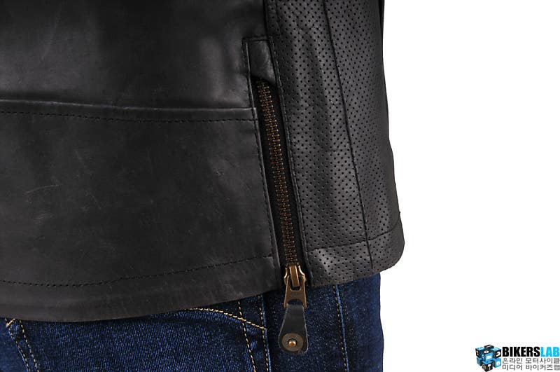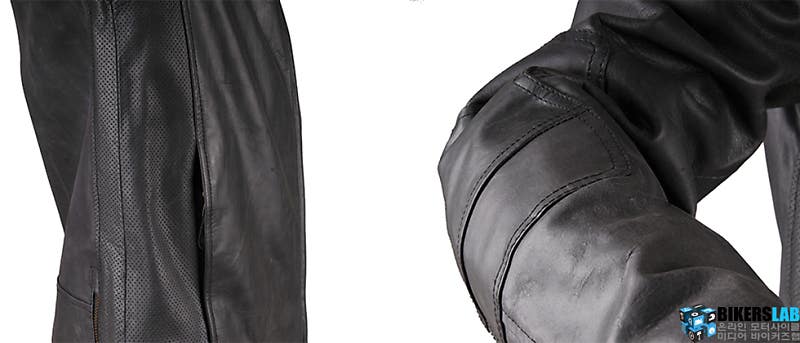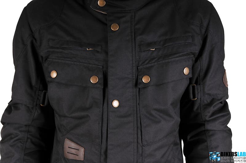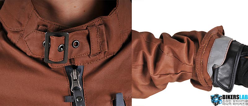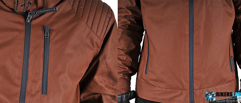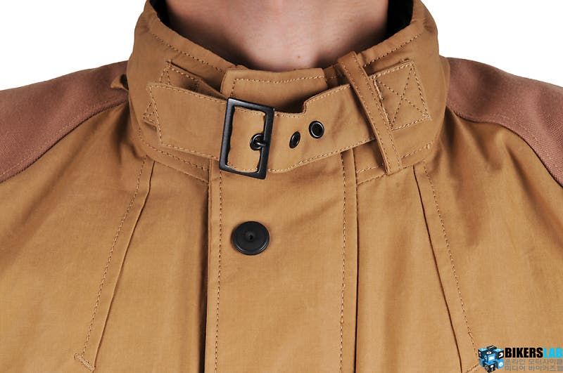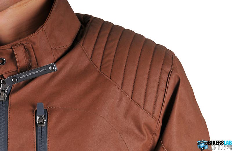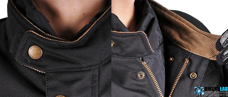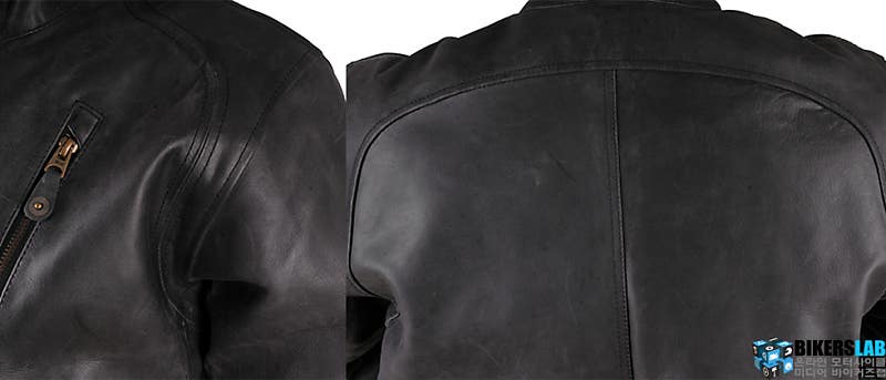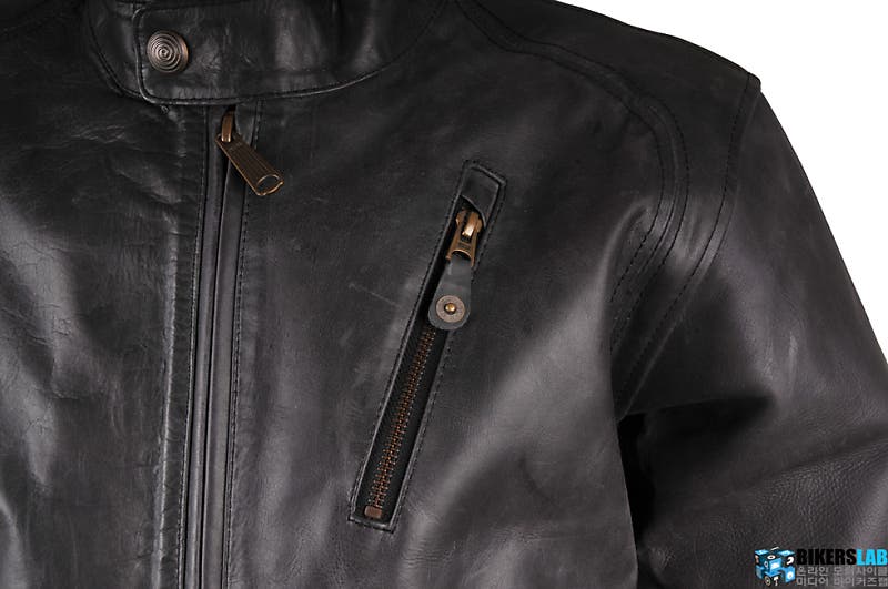 칼라는 다소 길게 위치해 있으며, 똑딱이 단추를 이용해 체결할 수 있다. 팔꿈치 보호대가 위치한 외부에 덧댄 가죽 패널은 멋도 멋이지만 사고 시 한층 더 높은 안전성을 제공한다. 옆 라인과 전면 체결부 안쪽에 존재하는 벤틸레이션은 가죽소재의 단점이라고 할 수 있는 통기성을 명쾌하게 해결해냈다.
