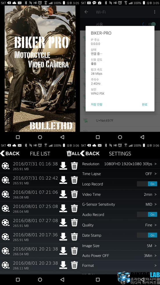 바이커프로 앱은 본체에 전원이 들어오고 와이파이를 연결했을 경우에만 실행할 수 있다. 또한 와이파이를 연결해 앱을 실행했다 하더라도, 모터사이클이 주행을 하면 자동으로 와이파이가 끊겨 앱이 종료된다. 때문에 녹화된 파일을 확인 및 다운로드 할 경우, 앱이 실행된 상태에서 하거나 혹은 본체의 SD카드를 빼서 확인해야 한다. 본체는 외부에 장착할 수 있기 때문에 SD카드는 쉽게 뺄 수 있다.