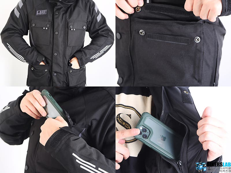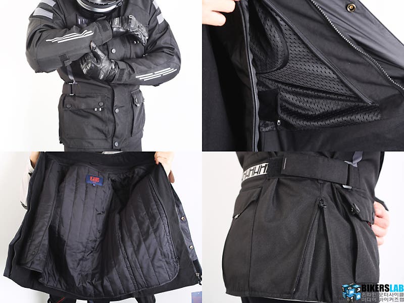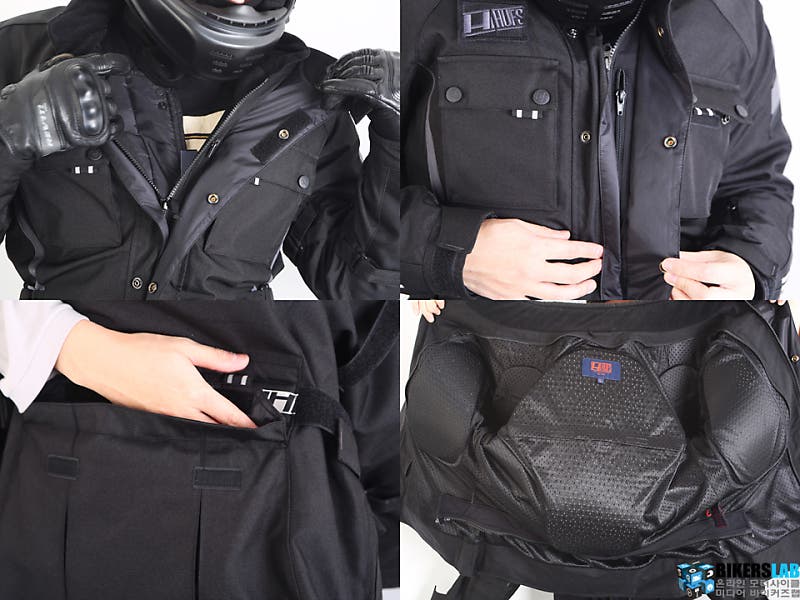 4포켓 재킷은 네 곳의 포켓과 내부 수납공간을 마련했고 덮개 및 지퍼를 부착해 소지품의 이탈을 방지했다. 또한 왼쪽 팔에는 카드 수납 공간을, 등 하단 부분에는 우의를 접어 수납할 수 있는 공간을 마련해 실용성을 높였다. 지퍼는 방수 처리했고 가림막을 부착해 주행풍의 유입을 차단했다. 이 밖에도 등, 어깨, 팔꿈치, 가슴에 보호대를 장착했고 각 부분에 리플렉터를 적용하며 안전성을 확보했다. 4포켓 재킷은 손목, 팔, 허리, 옆구리의 사이즈 조절이 가능하고 지퍼를 통해 하의와 연결할 수도 있다.