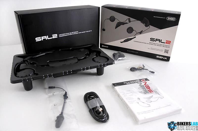 SRL2의 박스를 개봉했다. 제품이 날렵한 만큼 구성도 담백하다. 블루투스 모듈–버튼 조작 모듈(좌측)-안테나 모듈(우측)과 스피커는 케이블을 통해 하나로 연결돼 있다. 마이크는 풀 페이스용 마이크와 오픈 페이스용 마이크를 모두 제공한다. 이 밖에 충전기 케이블, 설명서, 마이크 커버가 동봉된 심플한 구성이다.
