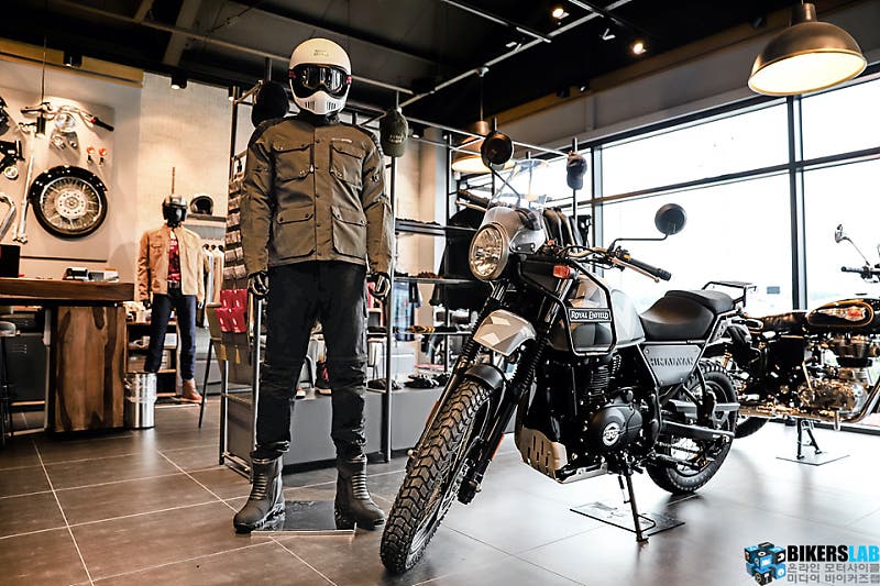 히말라얀은 큼지막한 21인치 프론트 휠과 여유 있는 220mm 최저 지상고로 온로드와 오프로드를 아우르는 멀티퍼퍼스 모델이다. 히말라얀과 같은 멀티퍼퍼스는 장르 특성상 날씨 혹은 도로 환경에 구애받지 않고 보다 먼 거리를 주행해야 하기에, 라이딩 기어도 전천후 기능성을 갖춘 제품을 착용하는 것이 적합하다.
