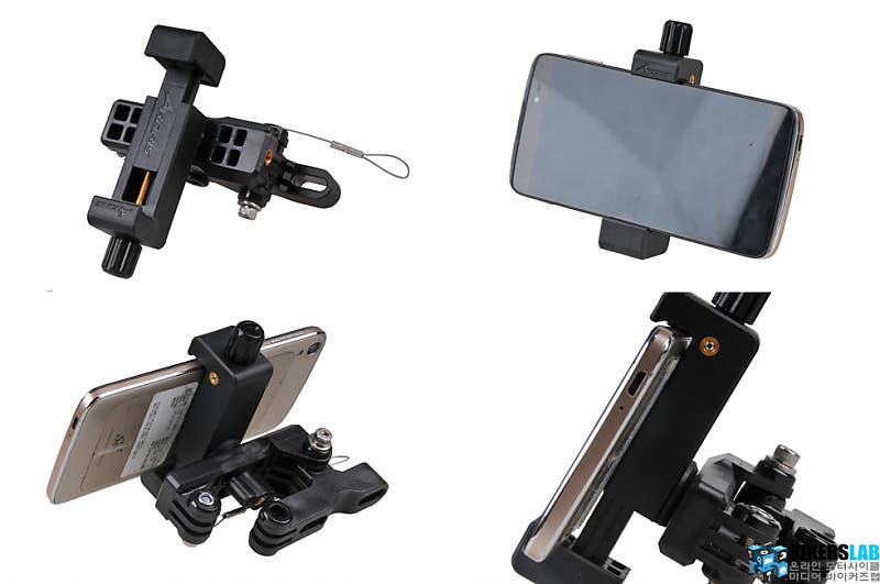 홀더는 총 다섯 군데에서 스마트폰을 고정한다. 측면 가운데 그리고 한쪽 측면의 두 곳과 아래 위를 각각 잡아준다. 역시 ‘ㄱ’자 형태로 고정부분을 꺾어 스마트폰의 각 귀퉁이가 빠질 염려는 적다. 또한 끝자락에 고무패킹을 붙여 액정에 상처가 생기지 않도록 했다. 아래 위를 잡아주는 부분은 뒷면의 육각 볼트로 사이즈를 조정할 수 있으며, 한번 맞춰놓은 후에는 별도로 조정할 필요가 없다. 반대쪽의 고정장치는 손으로 조절이 가능하고, 스프링타입으로 스마트폰을 쉽게 탈부착할 수 있다.