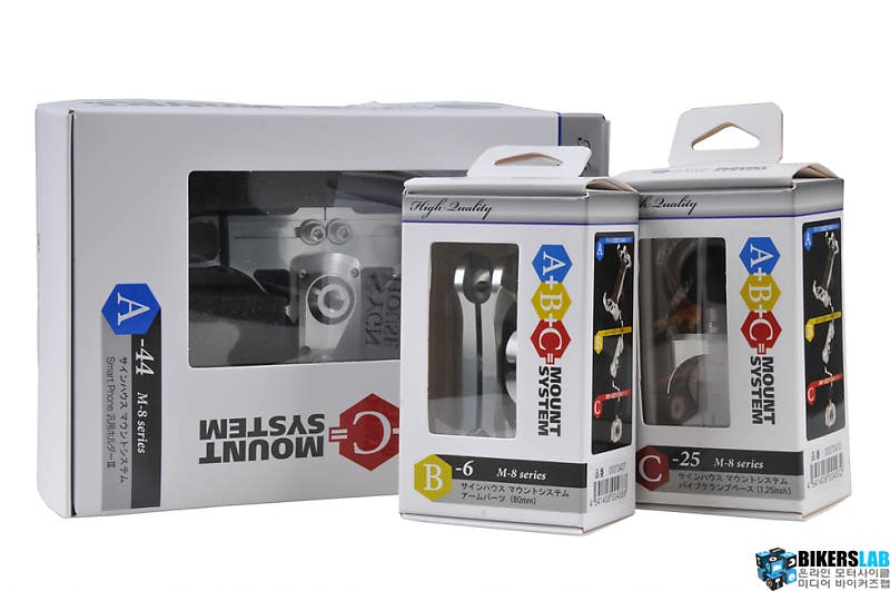 소재부터 남다르다. 사인하우스의 거치대는 알루미늄을 절삭 가공해서 제작했다. 때문에 강도와 내구성 등이 뛰어나다. 또한 홀더(A)와 암(B)과 베이스(C)의 세 가지 파츠로 나눈 구성품 각각의 품질도 모두 우수하다. 나머지 제품과 한데 묶어서 보면 디자인을 했다라는 느낌을 강하게 받을 정도로 외관상 장점이 두드러진다. B파츠는 길이를 달리한 두 종류 중 선택할 수 있고, C파츠는 핸들바, 미러, 탑브릿지 등 각각에 장착할 수 있는 형태로 구성했다. A, B, C 파츠가 모두 갖춰져야 장착이 가능하다.