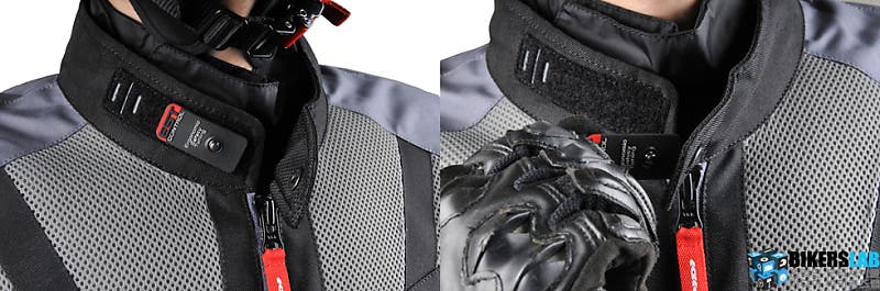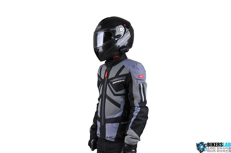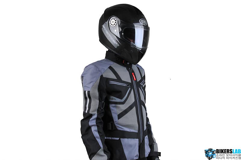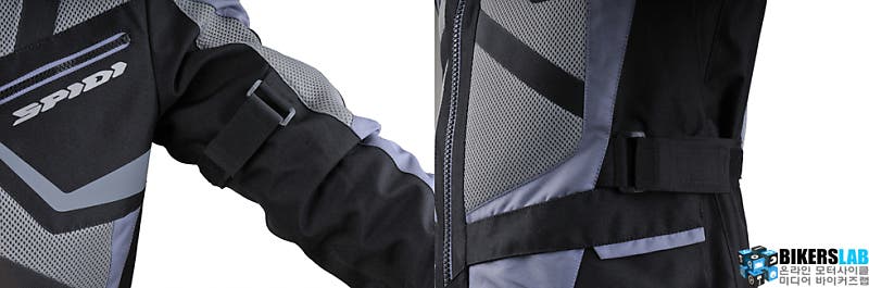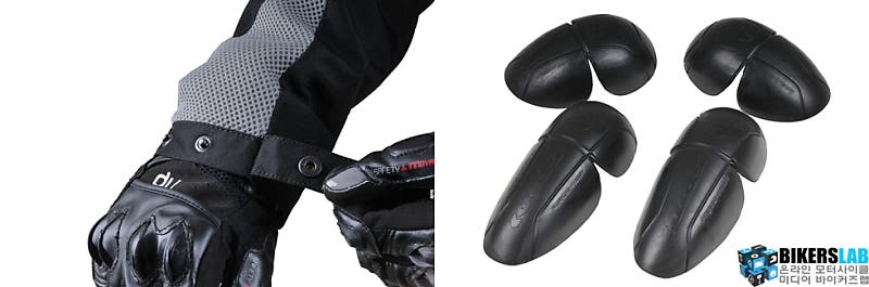 팔뚝과 허리는 벨크로 방식, 소매는 단추 타입으로 사이즈를 조절할 수 있다. 칼라 역시 상황에 따라 조절할 수 있으며, 탈부착이 가능한 벨크로 타입에 단추를 적용한 E.S.T.컨트롤(Ergonomic Safety Tuning Control) 시스템으로 조절범위가 자유롭고 편리하다. CE인증을 만족한 프로텍터는 어깨와 팔꿈치에 기본으로 포함되며, 백프로텍터는 별도 구매다. 하단 라인에 마련한 조임 끈을 활용해 주행풍으로 펄럭이지 않도록 조일 수 있다.
