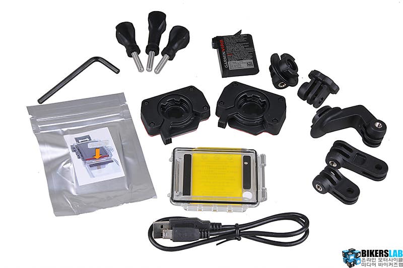 접착 마운트는 평면과 곡면의 두 가지 타입이 있으며, 길이와 형태를 달리한 연결대 및 노브로 원하는 곳에 용이하게 장착할 수 있다. 카메라 삼각대를 활용할 수 있도록 삼각대 전용 마운트도 제공한다. 이 밖에 육각 렌치, USB케이블, 습기패드, 방수케이스 추가 커버 등이 함께 동봉된다.