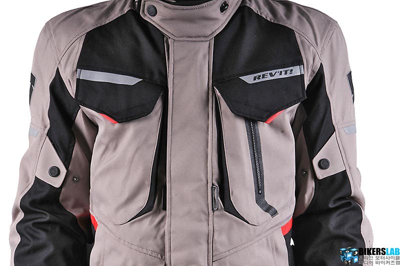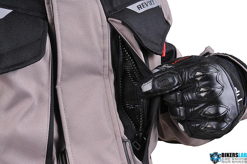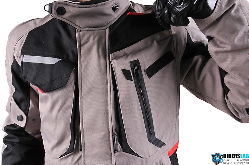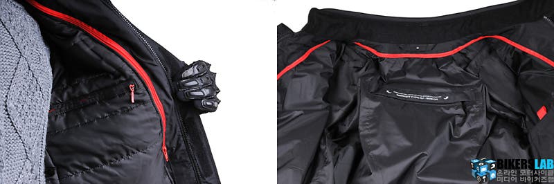 전면의 상단 포켓은 벨크로 타입이며, 하단은 지퍼로 여닫는다. 모두 깊이가 충분해 소지품을 수납하기 수월하며, 상단의 왼쪽에는 지퍼 타입의 포켓을 하나 더 추가해 활용도를 높였다. 재킷을 착용한 상태에서 포켓 덮개를 열고 위에서 손을 집어넣어 물건을 꺼내는 것보다 측면에서 지퍼를 열고 꺼내는 편이 훨씬 편리하다. 상단의 포켓 라인 안쪽에는 지퍼로 여닫을 수 있는 통풍구를 마련했다.