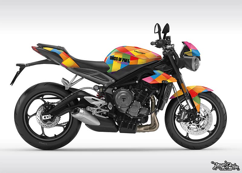 트라이엄프가 스트리트 트리플 RS에 화려한 색채를 입힌 할리퀸 에디션을 공개했다. 이 모터사이클은 올해 2월 개봉 예정인 DC코믹스의 빌런 영화 버즈 오브 프레이(Birds of Prey)에 스트리트 트리플RS가 등장하는 것을 기념하기 위해 제작한 것이다.