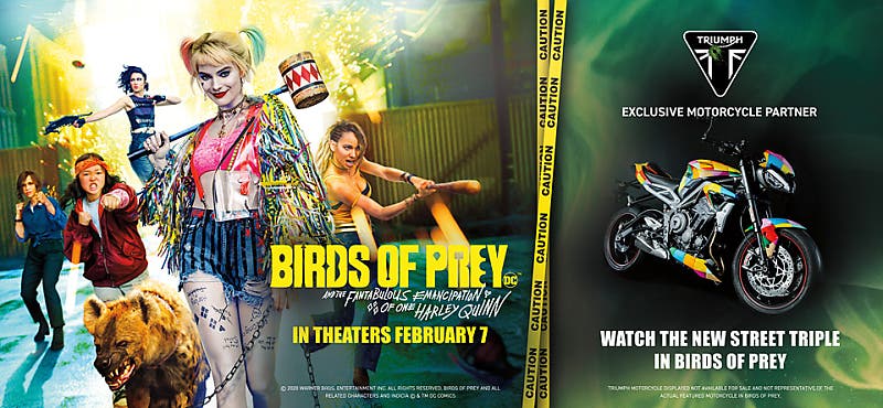 스트리트 트리플 RS는 765cc 직렬 3기통 엔진을 탑재해 123마력의 최고출력, 8.0kg*m의 최대토크를 발휘하는 스포츠 네이키드다. 역동적인 퍼포먼스와 공격적인 디자인이 할리퀸과 잘 매치된다. 영화 버즈 오브 프레이는 할리 퀸의 화려한 해방이라는 소제목에서 알 수 있듯이 할리 퀸이 조커와 헤어진 뒤 벌어지는 스토리를 담았다. 수어사이드 스쿼드에서 인상적인 할리 퀸 연기를 선보인 마고 로비가 이번에도 할리 퀸 역할을 맡았다.