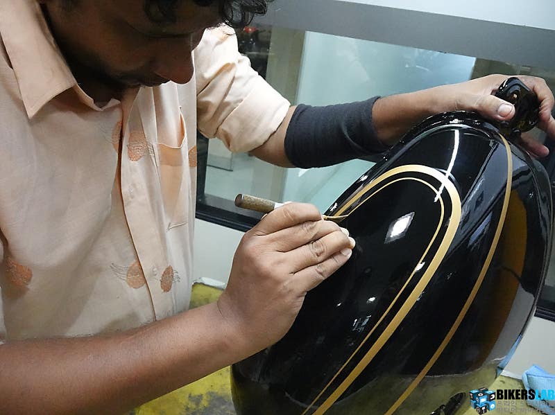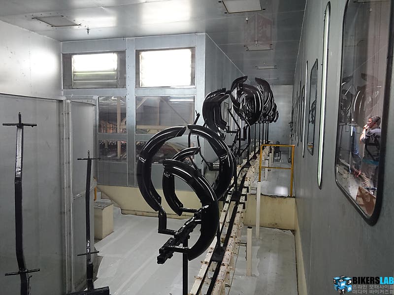도색은 사람보다는 기계의 몫이 컸다. 도색-코팅-건조로 이어지는 작업이 100% 자동화로 이어진다. 컨베이어 레일에 카울이 올려 지면 모든 작업은 기계가 알아서 진행했다. 다만 도색 구간에도 인간의 손길이 묻어났다. 그것은 바로 연료탱크에 페인팅 작업을 하는 것이다. 이 작업은 화공이 펜을 들고 도료를 묻혀 손수 라인을 그려 넣는다. 마치 기계처럼 오차 없이 반듯하게 칠해지는 라인을 보며 감탄을 금치 못했다.