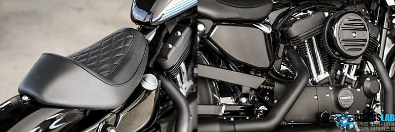 푸시로드를 제외한 실린더 헤드, 냉각 핀, 크랭크 케이스, 배기관 및 머플러 등을 모두 블랙 컬러로 통일해 강한 인상을 심었다. 전장은 15mm 길어졌고, 시트높이는 25mm낮아졌다. 또한 아이언1200의 ‘카페 솔로 시트’는 고급스러운 무늬는 물론, 요추를 확실히 받쳐줄 수 있도록 디자인해, 멋스러움과 제대로 된 라이딩 포지션을 완성하는데 일조했다.