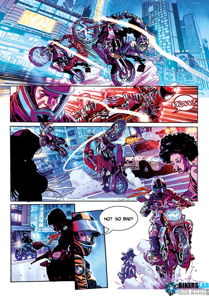 바로 BMW가 최초로 제작한 그래픽노블과 함께 말이다. BMW는 이탈리아의 파니니그룹의 독일 법인인 파니니 출판사(Panini Verlags)와 컬래버레이션으로 ‘라이더스 인 더 스톰(riders in the storm)’을 제작했다. 라이더스 인 더 스톰은, 세상을 지배하며 인류를 파멸로 몰아붙이는 악의 세력인 메가보어(Megavore)군단에 맞서는 영웅의 이야기를 그린다.