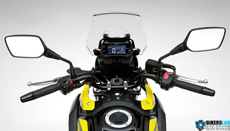 절도 있게 잘라낸 윈드쉴드 안쪽에는 디지털 타입의 LCD계기반이 자리하며, 계기반 왼쪽으로 파워 소켓이 자리했다. 연료탱크는 장거리 투어에 적합하도록 17L의 용량을 갖췄다. V스트롬250은 오프로드보다 온로드가 중심이 되지만, 센터스탠드, 탑/사이드 케이스, 너클가드 등의 액세서리를 장착할 수 있어 어드벤처의 분위기를 꾀했다.