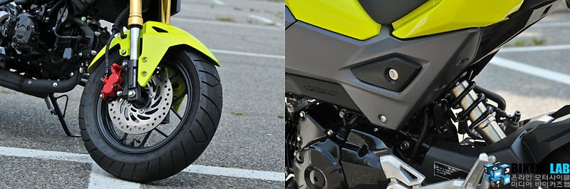 도립식 텔레스코픽과 모노 쇽업쇼버의 전/후륜 서스펜션은 적당히 충격을 거르면서도 자세를 곧잘 붙들어 맨다. 부드럽지만 무르지 않고 필요한 만큼 단단하게 버틴다. 이렇듯 도심 커뮤터와 익스트림 사이를 절묘하게 휘어잡은 세팅이 MSX125의 가치를 높여준다. 거동이 날카롭기 보다는 요리조리 말 그대로 재롱부리듯 리드미컬하게 달리는 맛이 외모만큼이나 유머 있다.