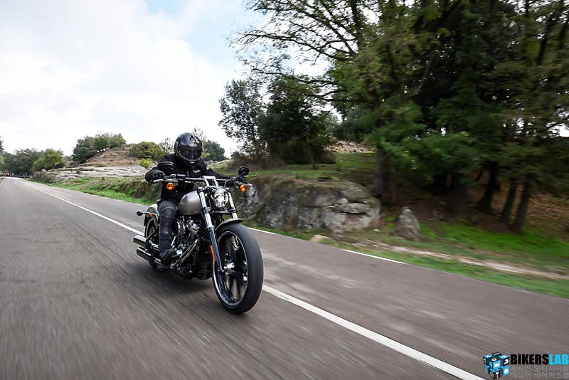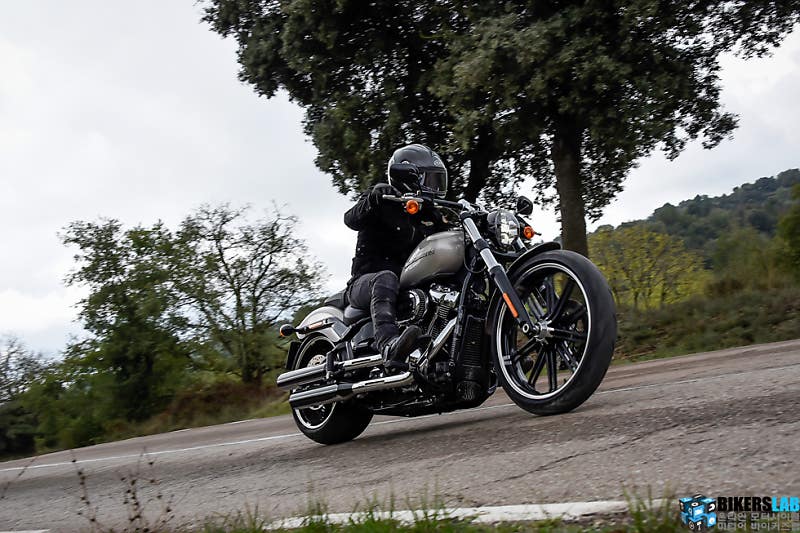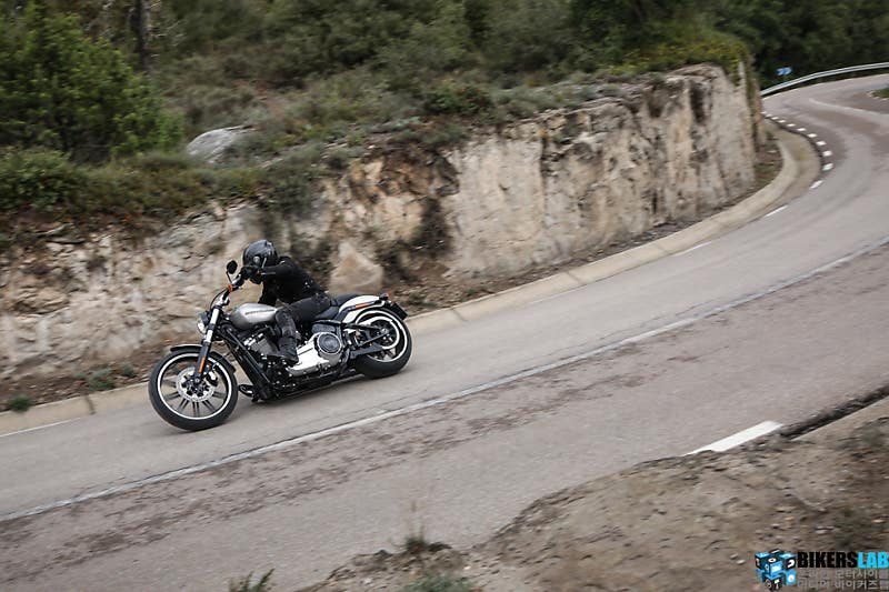 묵직함이 느껴진다. 바로 직전에 스트리트 밥을 탔을 때처럼 코너를 대할 순 없다. 빠르게 코너를 쫓을 필요도 없으며, 조금 더 여유를 가지고 코너에 진입해야 한다. 브레이크아웃은 1,868cc의 114엔진을 마음 놓고 사용할 수 있는 상황과 마주했을 때, 막강한 토크를 터뜨려 돌파하듯이 튀어나가는 맛으로 즐기면 된다. 코너를 돌고 있는 상황보다는 탈출 시점에서 서서히 차체가 일어남과 동시에 가속하는 그런 시점 말이다. 물론 브레이크아웃의 움직임을 이해하면 편하다. 낮고 긴 차체를 기울이는 맛은 스포츠 장르의 날카로운 코너와는 또 다른 재미를 준다. 하지만 코너링의 한계가 높지 않다 보니 부푼 라인을 수정하기에는 빠듯하다.