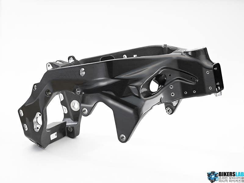 HP4 레이스의 놀라운 수치 중 하나는 바로 146kg의 건조중량이다. 장비중량도 171.4kg에 불과하다. 이런 경이로운 무게를 실현할 수 있었던 이유는 카본 프레임 덕분이다. BMW는 이미 자동차 분야에서 카본 바디 구조를 선보이며, 자사의 우수한 카본 기술력을 입증했다. 카본은 모터사이클 분야에서도 자주 애용하지만, 메인 프레임에 사용한 경우는 흔치 않다.
