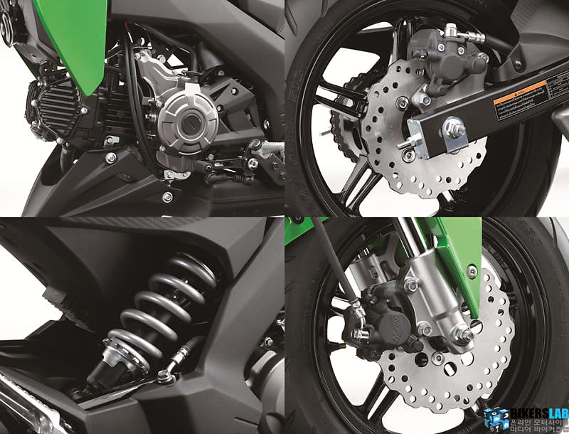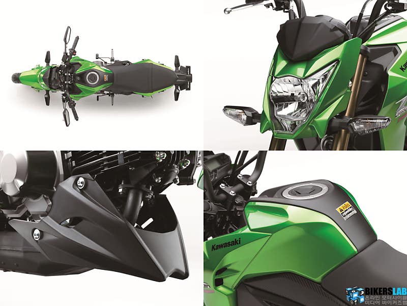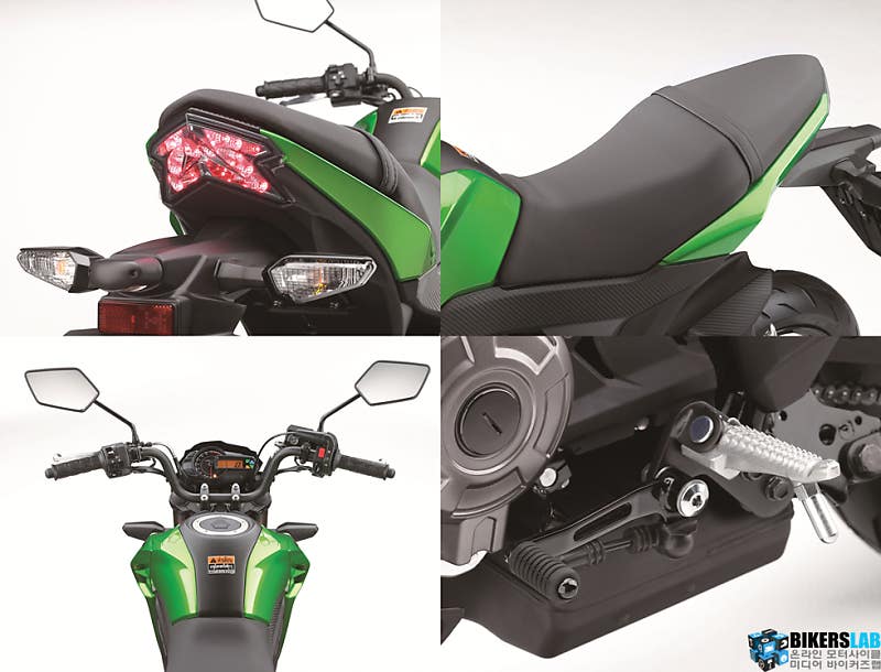 ‘Z’를 형상화한 테일램프는 LED를 적용해 디테일을 더욱 부각시켰고, 계기반은 아날로그/디지털 방식을 조합했다. 시트높이는 780mm로 경쟁기종대비 15mm 높지만, 차체가 작고 무겁지 않아 조작의 부담은 없다. 중량은 오히려 4kg 가벼운 101kg이다. 머플러는 차체 하부로 내려 질량집중화를 노림과 동시에 군더더기 없는 리어/사이드 라인을 완성했다. 또한 사이드라인과 리어펜더 등에 카본패턴을 넣어 스포티한 이미지를 강조했다.
