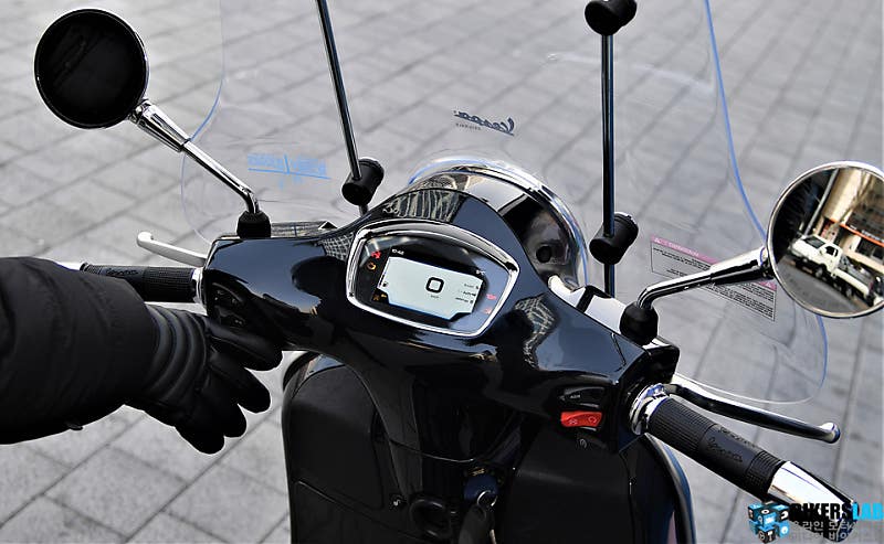 시승을 진행한 시점에는 100% 활용하지 못했지만 계기반의 뛰어난 시인성과 디자인은 확인할 수 있었다. 햇살이 내리쬐는 대낮에도 밝은 화면으로 시인성이 충분히 확보되었고 온도, 시간 등의 정보는 주행에 많은 도움을 줬다. 디지털 속도계는 아날로그 감성의 베스파와 이질적일 것이라 생각했지만 클래식과 디지털의 조합은 절묘했다.
