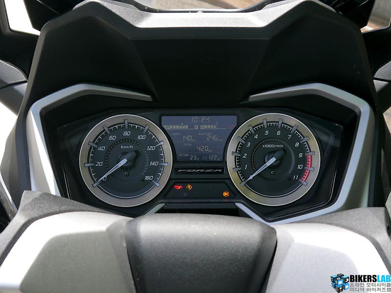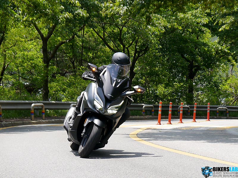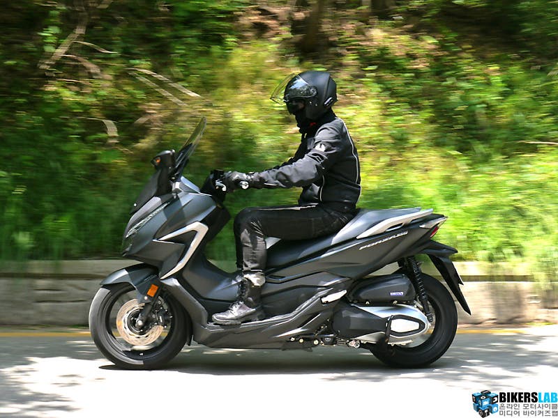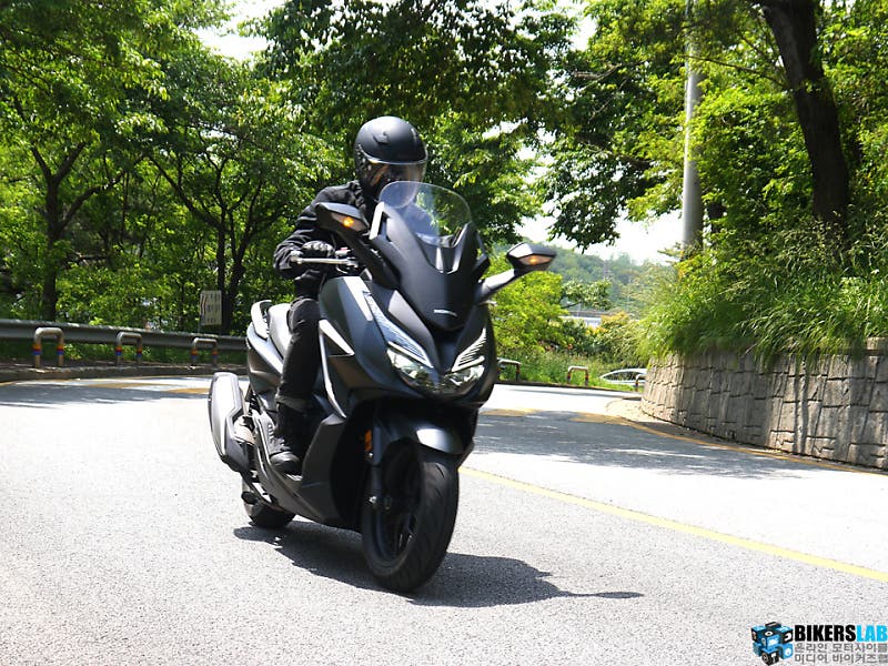 포르자 350은 예상보다 높은 출력 한계치를 보여줬다. 윈드 스크린을 가장 낮추고 상체를 웅크리면 제법 공격적인 포지션이 연출된다. 최대 토크가 나오는 시점은 이전 대비 500rpm 당겨진 5,250rpm이다. 그래서 정지 상태에서 200m까지 도달하는 시간도 빨라졌다. 주체하지 못해 꿈틀대는 가속감이라기 보다는 부드럽고 규칙적으로 출력을 쌓아 올린다는 인상이다. 토크 특성이 그래서인지 더욱 안정적이고 편안한 주행감각이다. 스로틀 보디와 흡기 밸브의 직경을 넓혀 얻어낸 결과이기도 하다. 100km/h를 넘어서도 스로틀 그립의 유격이 반 정도 남아있다. 마음만 먹으면 혼다가 발표한 최고 속도 수치인 137km/h도 너끈히 넘길 수 있을 것 같다.