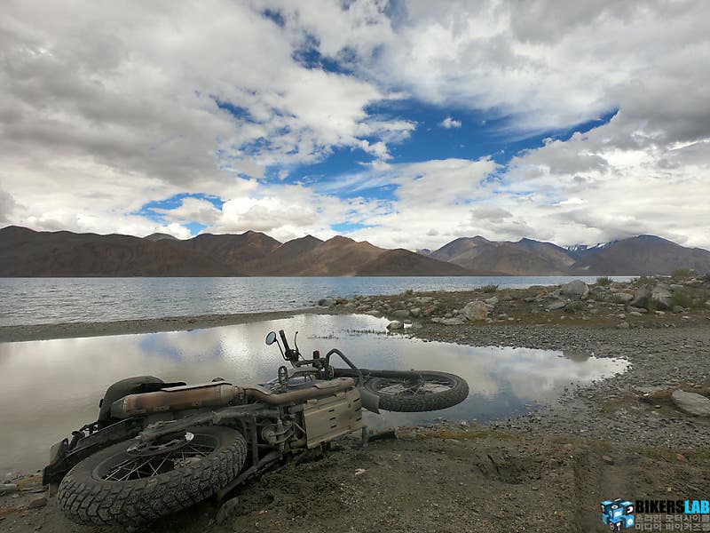 판공초에서의 하룻밤이 지나고 거점 도시인 로 돌아가는 날이다. 주행거리는 약 170km고 창 라 패스(Chang La pass, 5,360m)를 통과했다. 전 날과 마찬가지로 판공초 주변의 까다로운 오프로드부터 시작했다. 넘어진 기억 때문인지 다소 위축된 상태로 라이딩을 이어 나갔다. 판공초에서 기념사진을 촬영한 뒤, 호수 주변을 무사히 빠져 나왔다.
