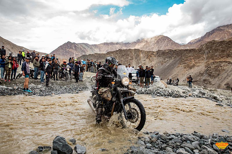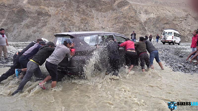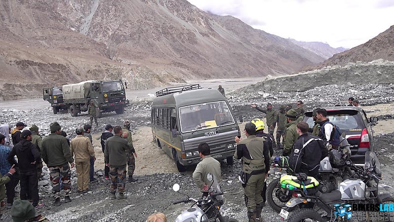 이런 상황이 닥칠 때면 지켜보던 이들은 함께 차를 밀었다. 우회할 길도 없었기에 물을 건너려는 차들이 길게 늘어섰고 모토히말라야팀도 차례를 기다렸다. 로드 매니저가 도강을 시도한 것을 시작으로 참가자들은 순서대로 도강을 시작했다. 넘어진 참가자도 있었지만 다행히 큰 사고 없이 물길을 건넜다.