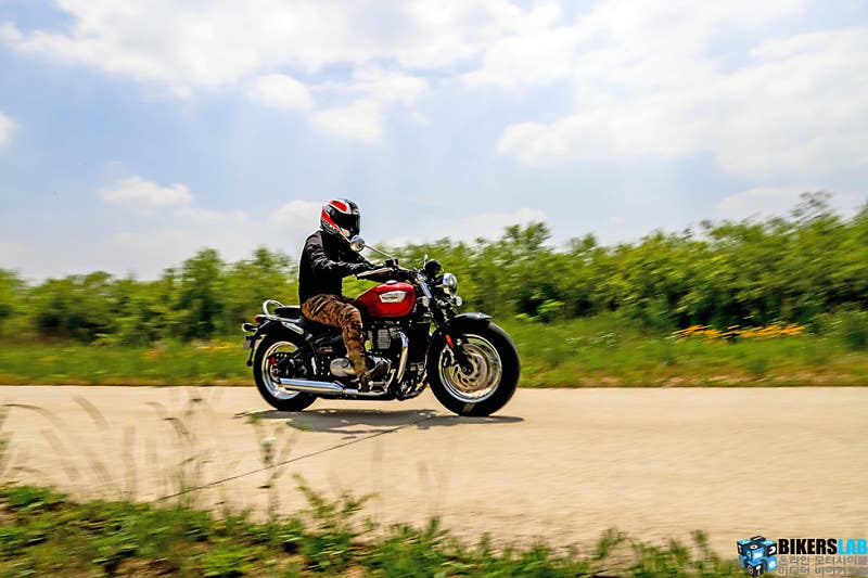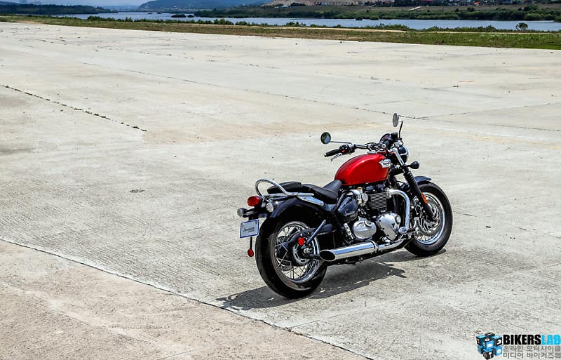 와인딩 로드는 속도를 부추기기 보다는 물 흐르듯 라인을 따라 부드럽게 탈출 하는 것이 이상적이다. 서스펜션은 프론트/리어 모두 KYB이며, 41mm의 프론트 포크와 프리로드 조절이 가능한 모노 쇽업소버를 장착했다. 한계가 그다지 높지 않고 연속된 요철과 큰 둔턱에 민첩하게 반응하지 않는다. 부족하다기 보다는 장르 특성에 맞는 세팅으로 필요 충분한 세팅을 갖춘 것. 핸들링 역시 부드럽지만 기민하지는 않다. 그럼에도 장르 내에서의 섀시는 유연해 연속된 코너와 고속 코너에서도 뒤뚱거리지 않는다. 스포츠 모터사이클만큼 빠를 수는 없지만 다음 동작으로 이어지는 과정이 매끄러워 수월하게 컨트롤 할 수 있다. 분명히 묵직하고 한계점이 높지 않은 모터사이클이지만, 뻣뻣하거나 버거움이 없다. 도심주행을 비롯해 굽이진 도로에서도 스피드마스터가 재미있는 이유고, 이러한 부분이 바로 조금 더 많은 사람들이 쉽게 접근할 수 있는 이점으로 작용한다.