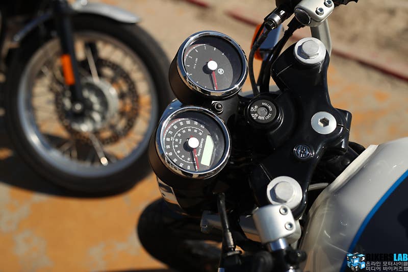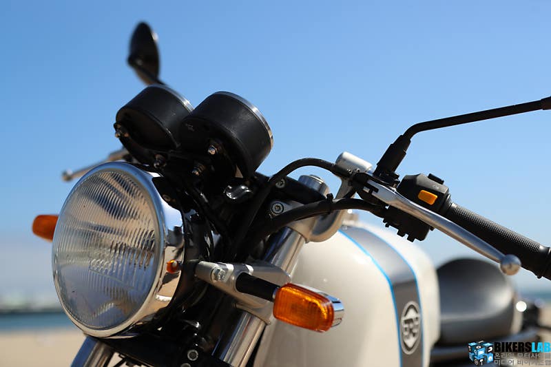 시트에 앉아 자연스레 포지션을 취해본다. 계기반과 연료탱크, 핸들바 뭉치와 클러치/브레이크 레버 등 시야에 들어오는 각 파츠들이 모나지 않다. 레트로 감성에 어긋나는 부분도 그렇다고 눈살을 찌푸리는 허술한 마감도 없다. 시트높이는 793mm지만 폭이 넓지 않아 발착지성이 불리하지 않고 가랑이도 불편하지 않다. 엉덩이를 좌우로 슬쩍 옮기기에도 무리 없다. 냉각핀이 촘촘하게 박힌 실린더, 두 가닥으로 뻗어 나온 배기 파이프, 커다랗고 둥근 알루미늄 엔진 케이스에 적힌 로얄엔필드, 키 ‘ON’을 부른다.